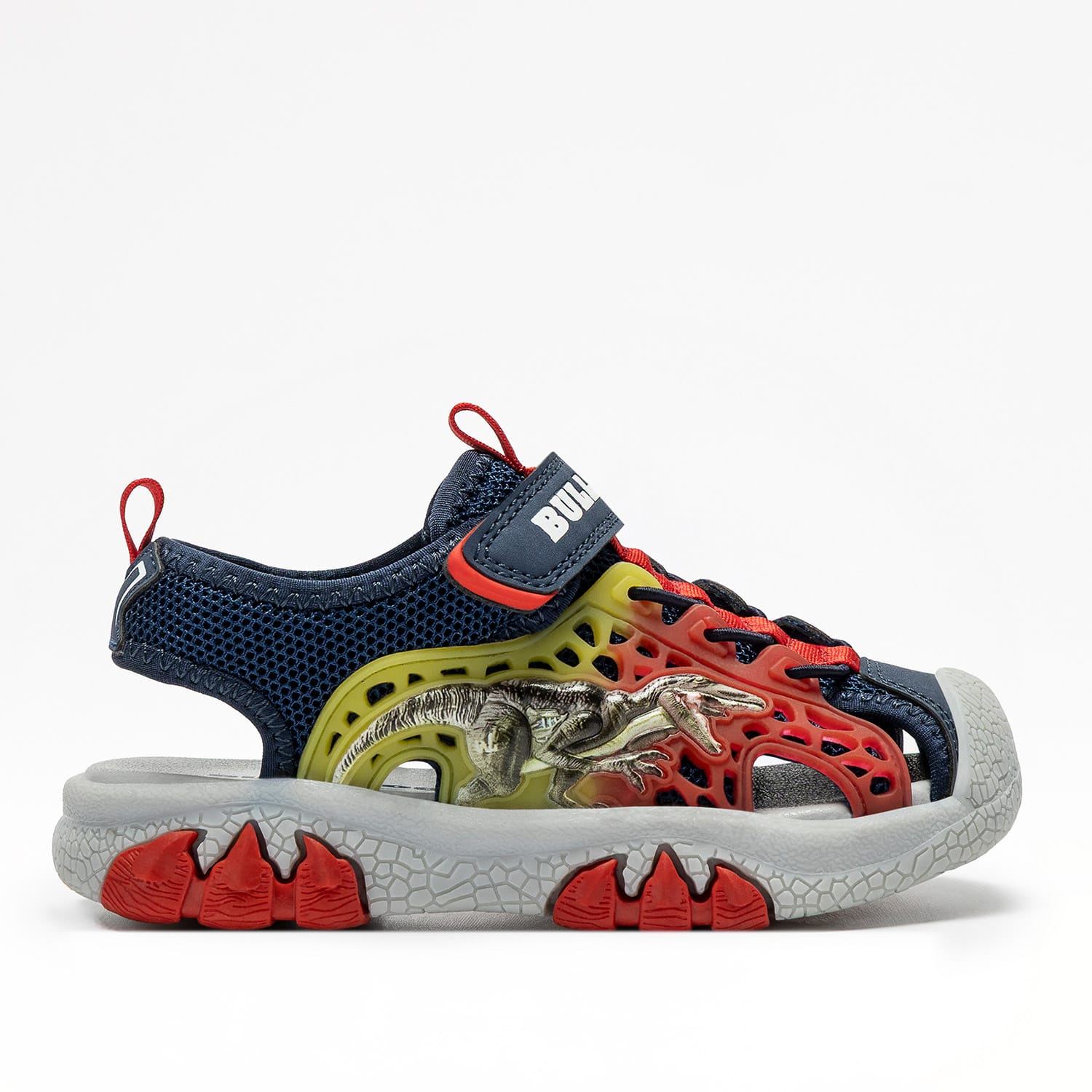 Τα σανδάλια Bull Boys, που χαρακτηρίζονται από αποκλειστικά σχέδια σε σχήμα δεινοσαύρου, με φωτάκια, διατίθενται σε πολλούς συνδυασμούς χρωμάτων. Όπως όλες οι δημιουργίες Bull Boys, έτσι και αυτά τα παπούτσια σχεδιάστηκαν με στόχο να ικανοποιήσουν τόσο τα γούστα των παιδιών όσο και τις ανάγκες των γονιών. Άνετα, στιβαρά και εξαιρετικά δροσερά, τα Bull Boys πέδιλα είναι ιδανικά για να συνοδεύουν τα παιδιά σε όλες τις φανταστικές τους περιπέτειες. Εύκολη εφαρμογή με ελαστικά κορδόνια και velcro.