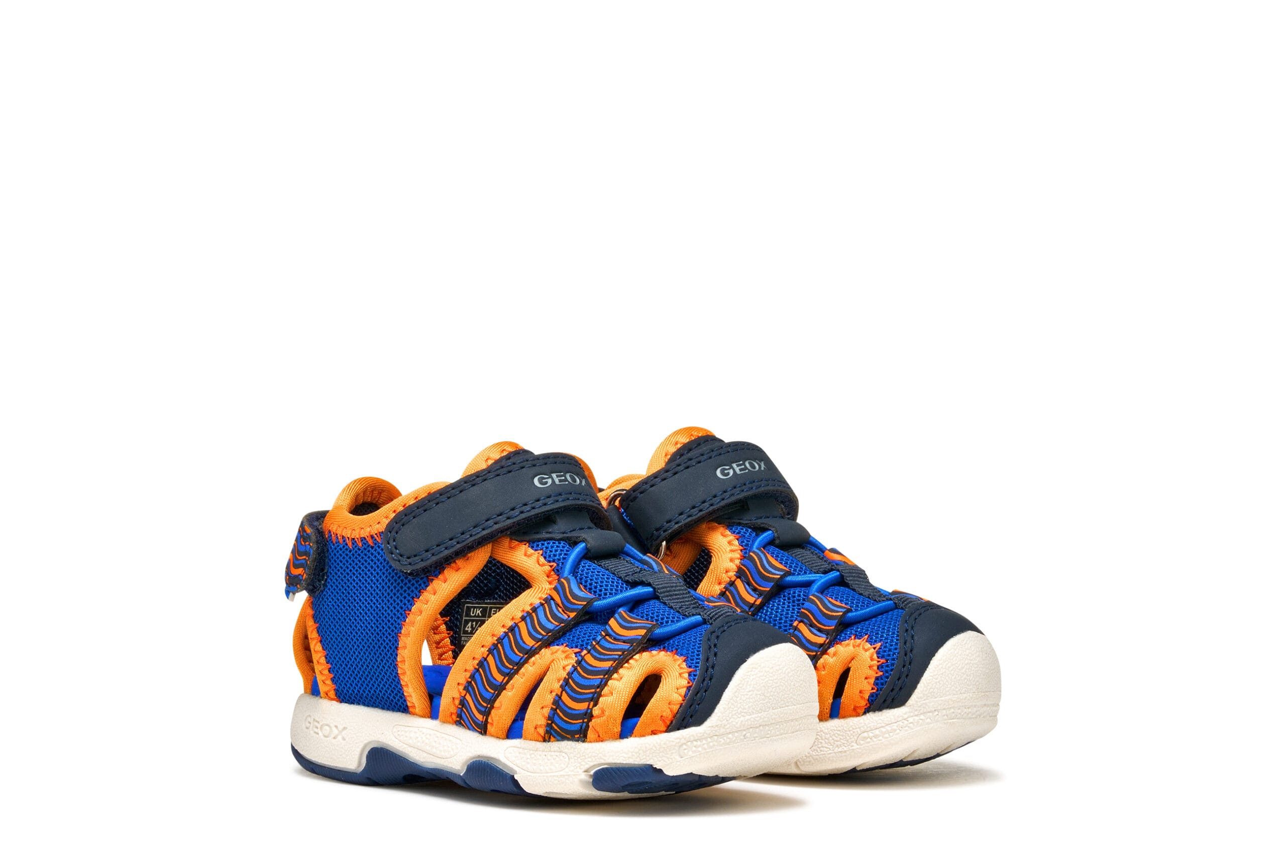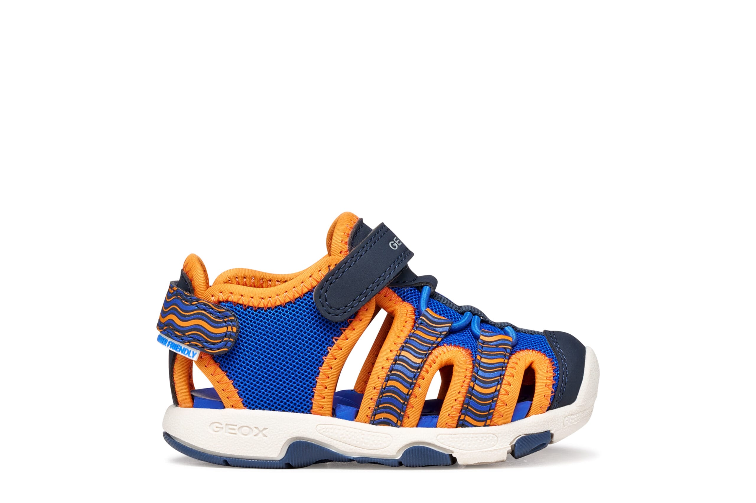 Άνετα, ελαφριά και αδιάβροχα παιδικά σανδάλια με κλειστά δάχτυλα. Σε αυτή την έκδοση, η οποία συνδυάζει βασιλικό μπλε και πορτοκαλί, διαθέτουν άνω μέρος από ανάγλυφο υλικό με εφέ δέρματος και διχτυωτό υλικό. Η Multy έχει εξωτερική σόλα που προσφέρει καλό κράτημα ακόμα και σε ολισθηρές επιφάνειες και είναι ιδανική για υπαίθριες περιπέτειες.