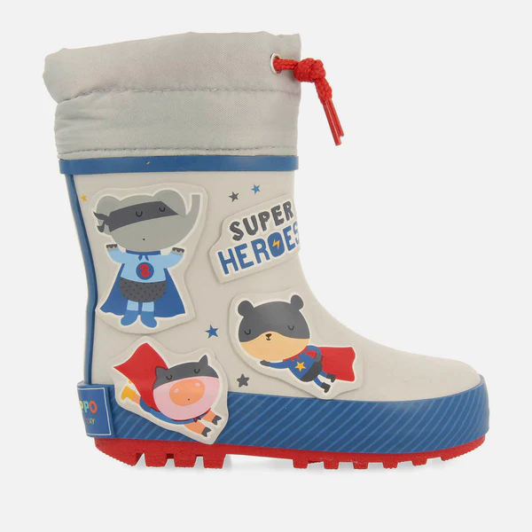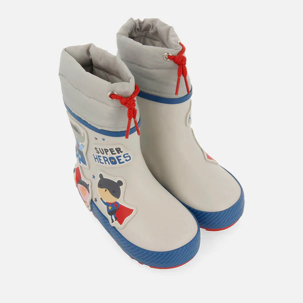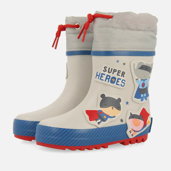 Θα νιώσετε σαν να έχετε υπερδυνάμεις! Γκρι αδιάβροχες μπότες με σήματα υπερήρωα. Έχουν ρυθμιζόμενο κολάρο από νάιλον και επένδυση από 100% πολυεστέρα και επενδεδυμένη εσωτερική σόλα. Η σόλα είναι κατασκευασμένη από φυσικό καουτσούκ και είναι ανθεκτική, αδιάβροχη και αντιολισθητική. Θα λατρέψουν τις βροχερές μέρες!